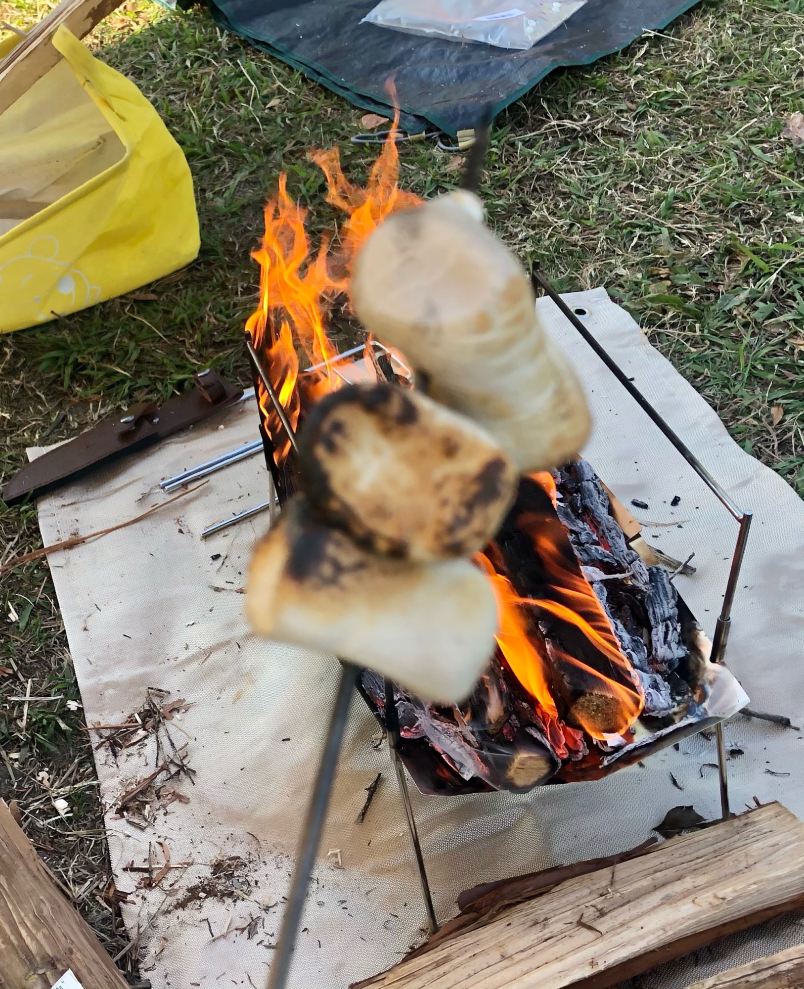 たれ一家の野外活動 焚き火で焼きマシュマロ